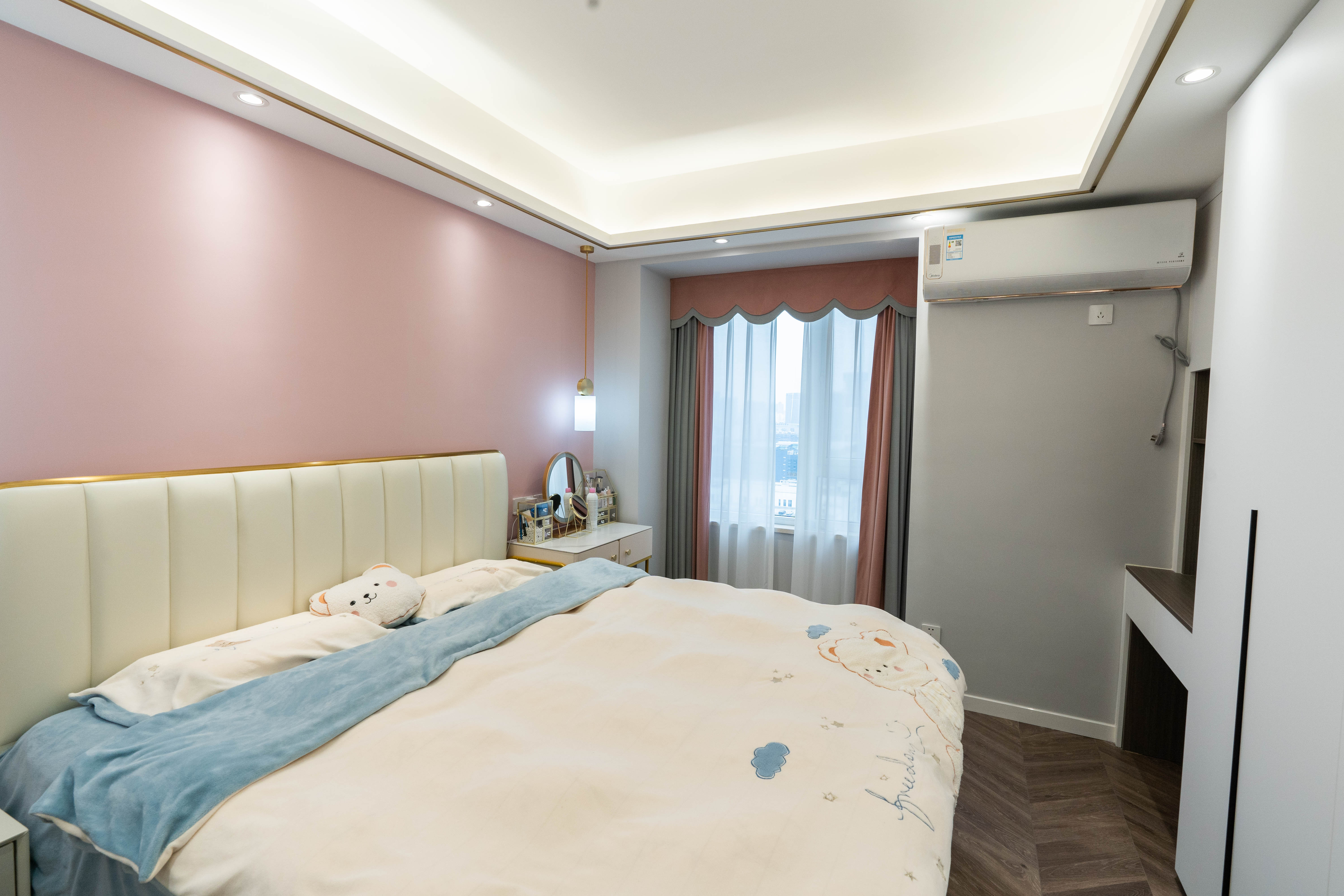• 煙粉色調柔和、平靜、低調、優雅,滿足女主人少女心的同時又不顯得幼稚。內側安置小腳床頭柜,方便存放小物件。金屬線條燈柔和不刺眼,滿足男主人床頭閱讀的需求。