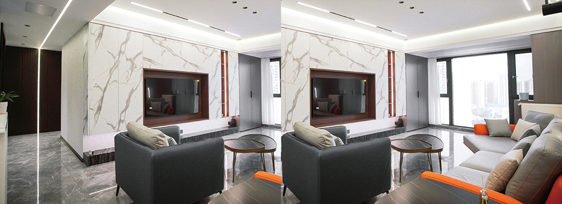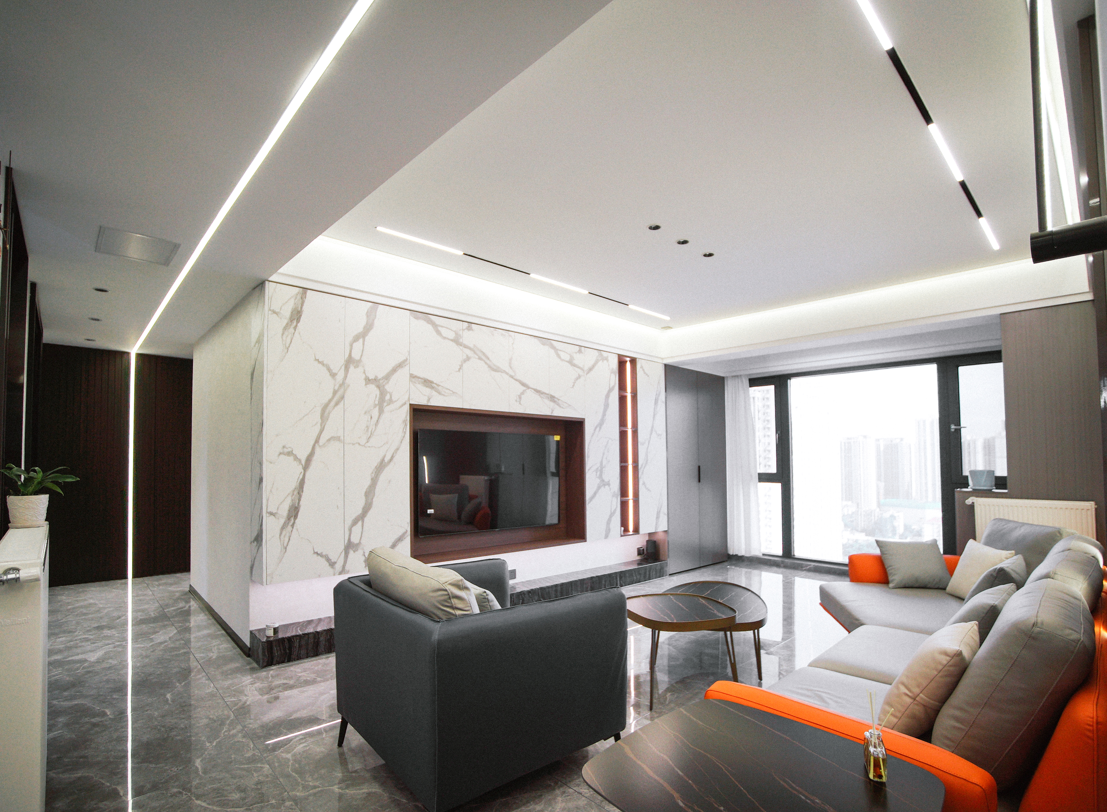 • 沙發背景墻這里做了個板材包邊的設計,一直延伸至陽臺儲物柜,兩者同色系的運用讓陽臺到客廳的過度更和諧。木質墻面錯落的燈帶設計,帶來現代時尚之美感。