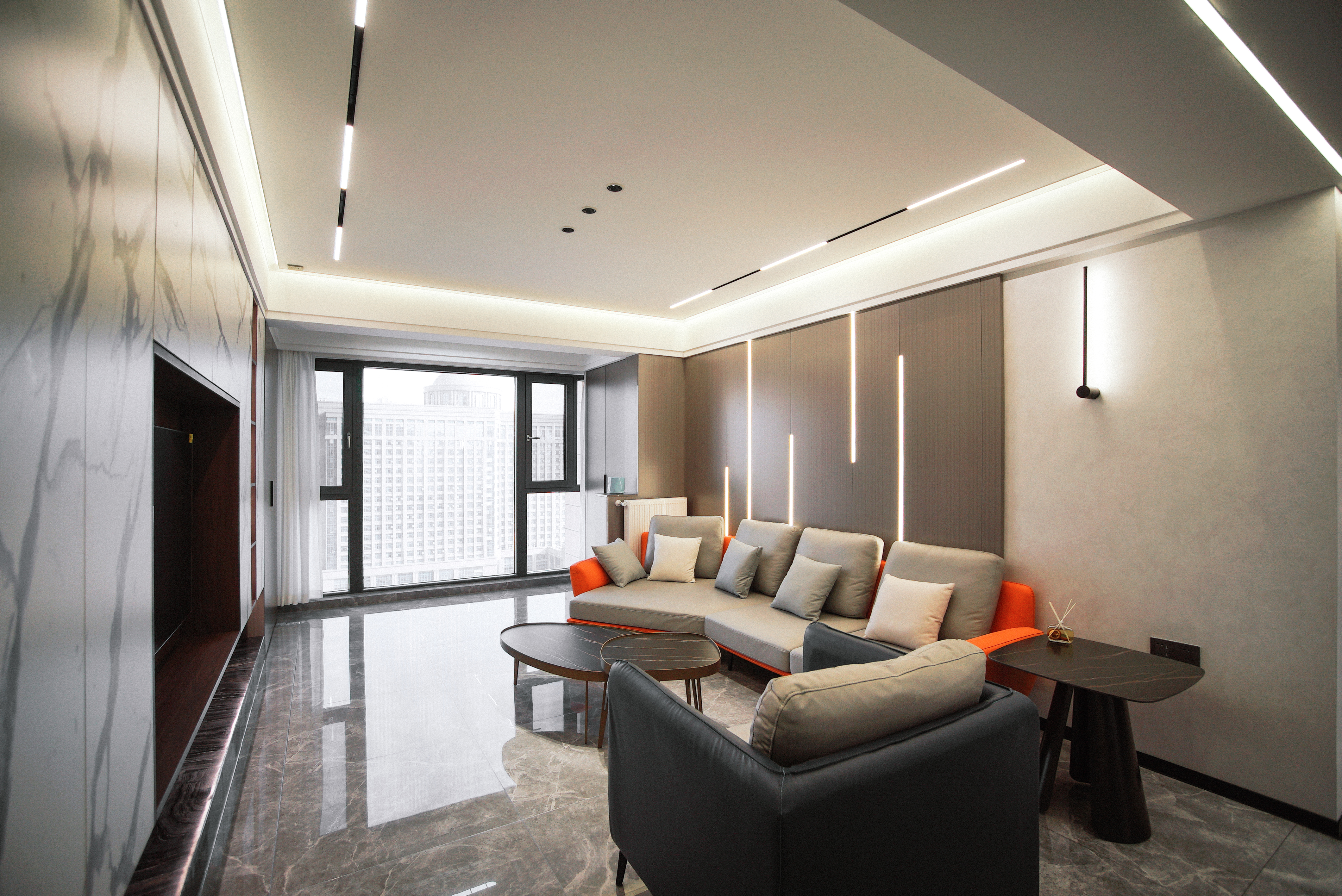 • 高低不規則茶幾直接落于大理石瓷磚,錯落有致,小巧有質感。黑灰色的沙發中添加了一抹橘色進行點綴,淡化了冷色調帶來的深沉感,為這方會客空間增加了一絲溫暖。