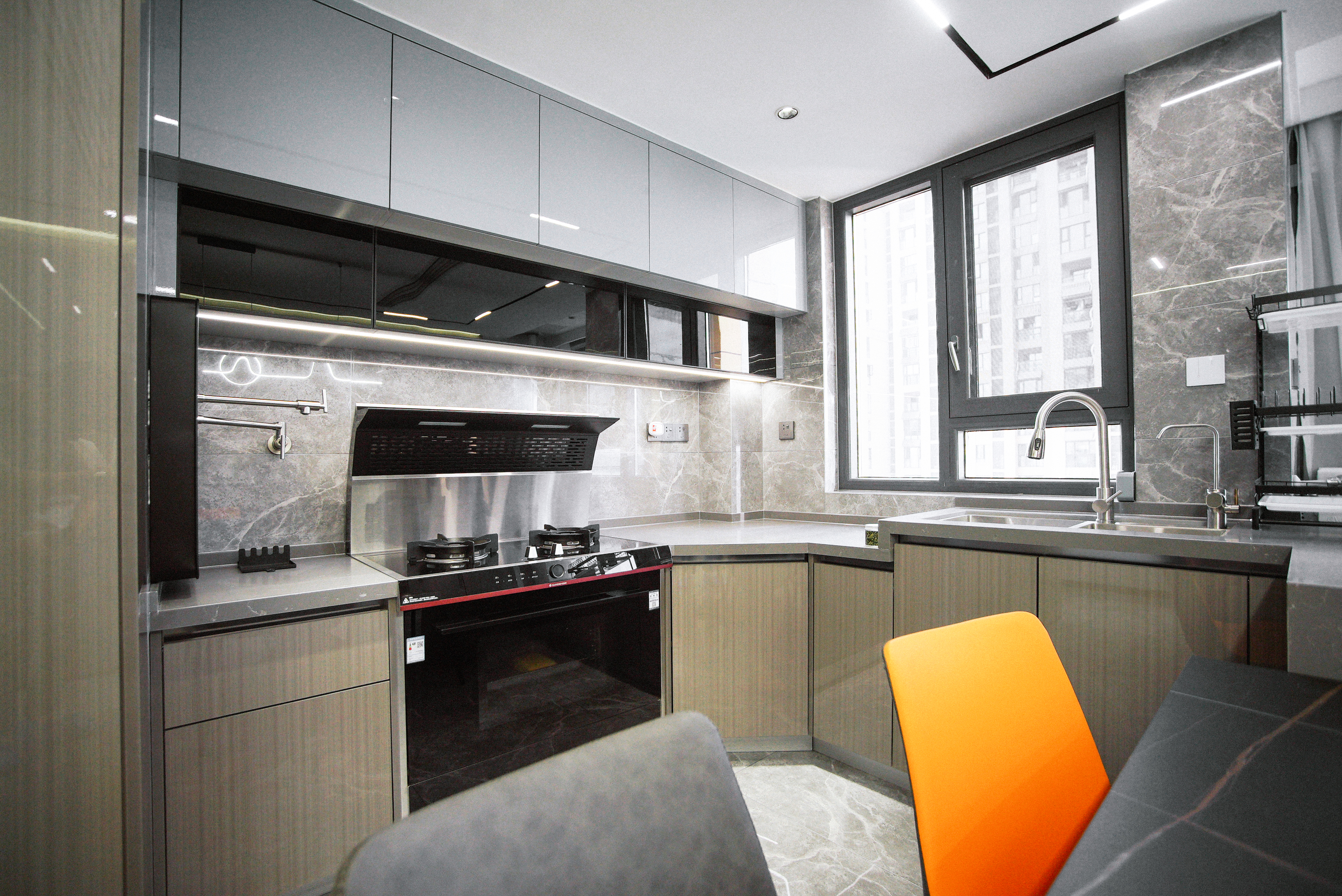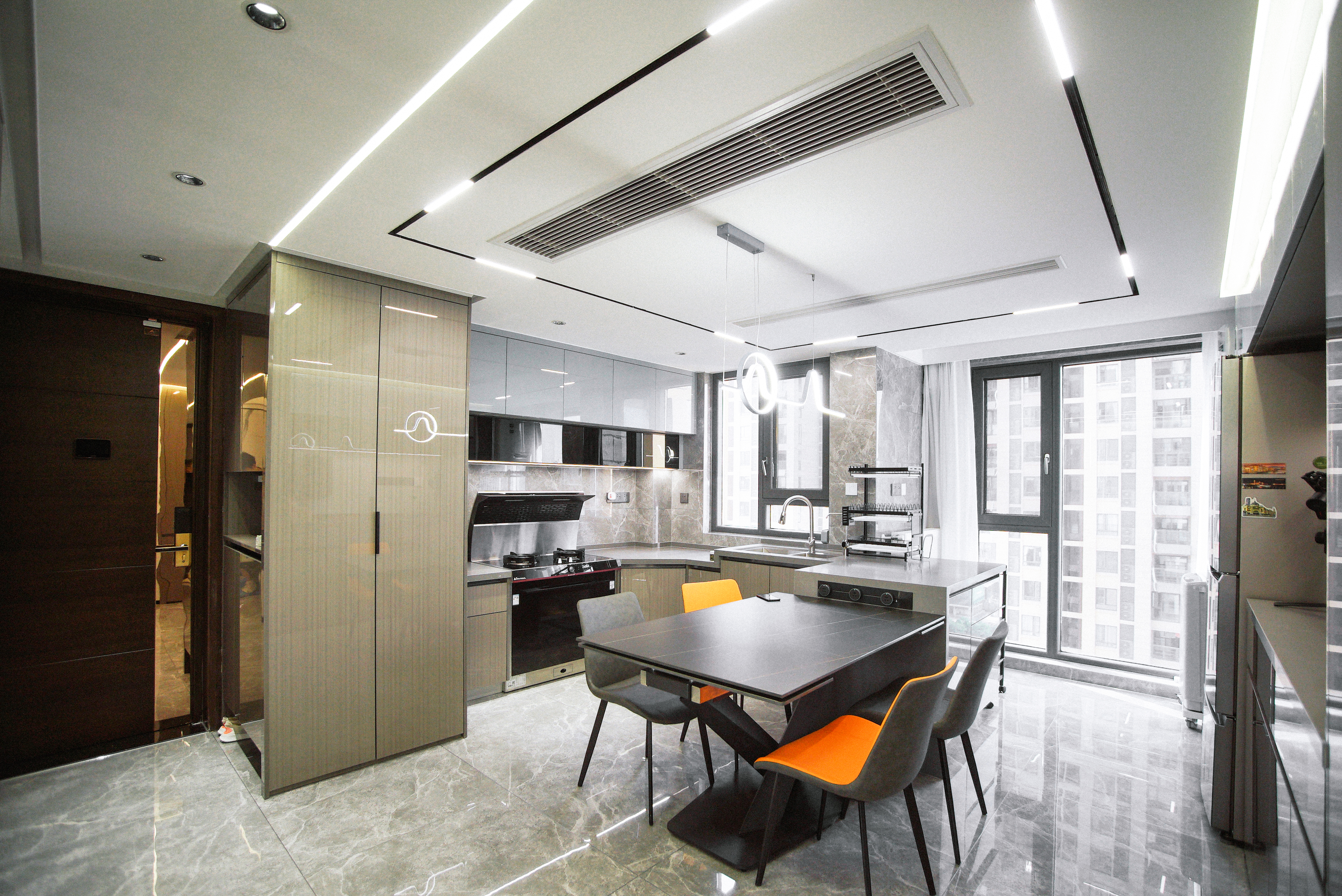 • 冰箱置于角落內嵌入餐邊柜與吊柜之間,讓整體看起來更和諧。巖板臺面上方裝上線性燈補光,避免背光時看不清。智能廚具的安裝,則讓生活更便利。