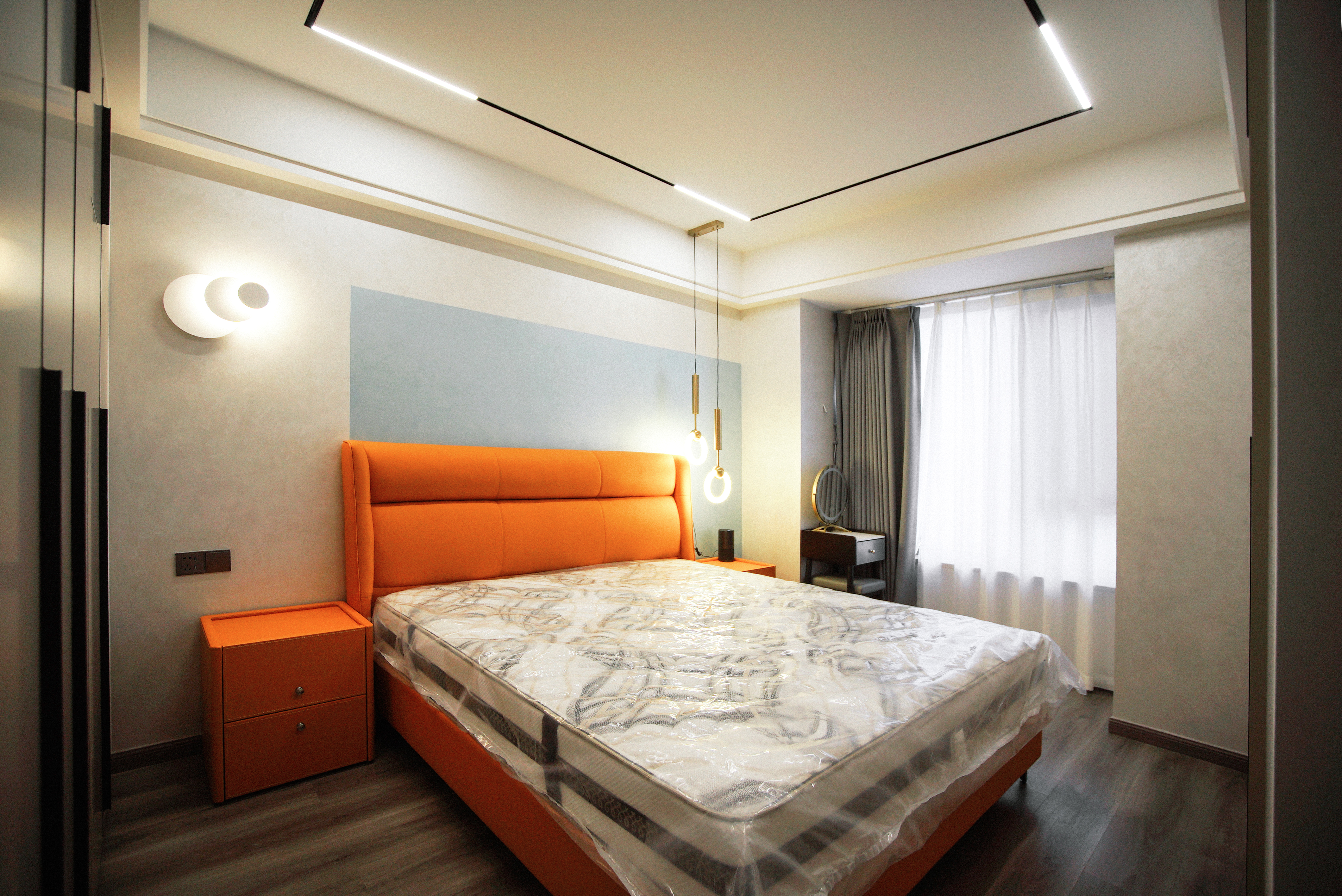• 愛馬仕橙的墻遇到了霧霾藍的墻,就像男、女主人用最真實的自己成就了最好的彼此。 軌道燈照亮四周,床頭分別用吊燈與壁燈進行裝飾補光。飄窗砸掉放置小梳妝臺,讓空間利用率更高。 床側床尾墻體做了整面墻的衣柜,大大滿足了業主儲藏收納的功能。