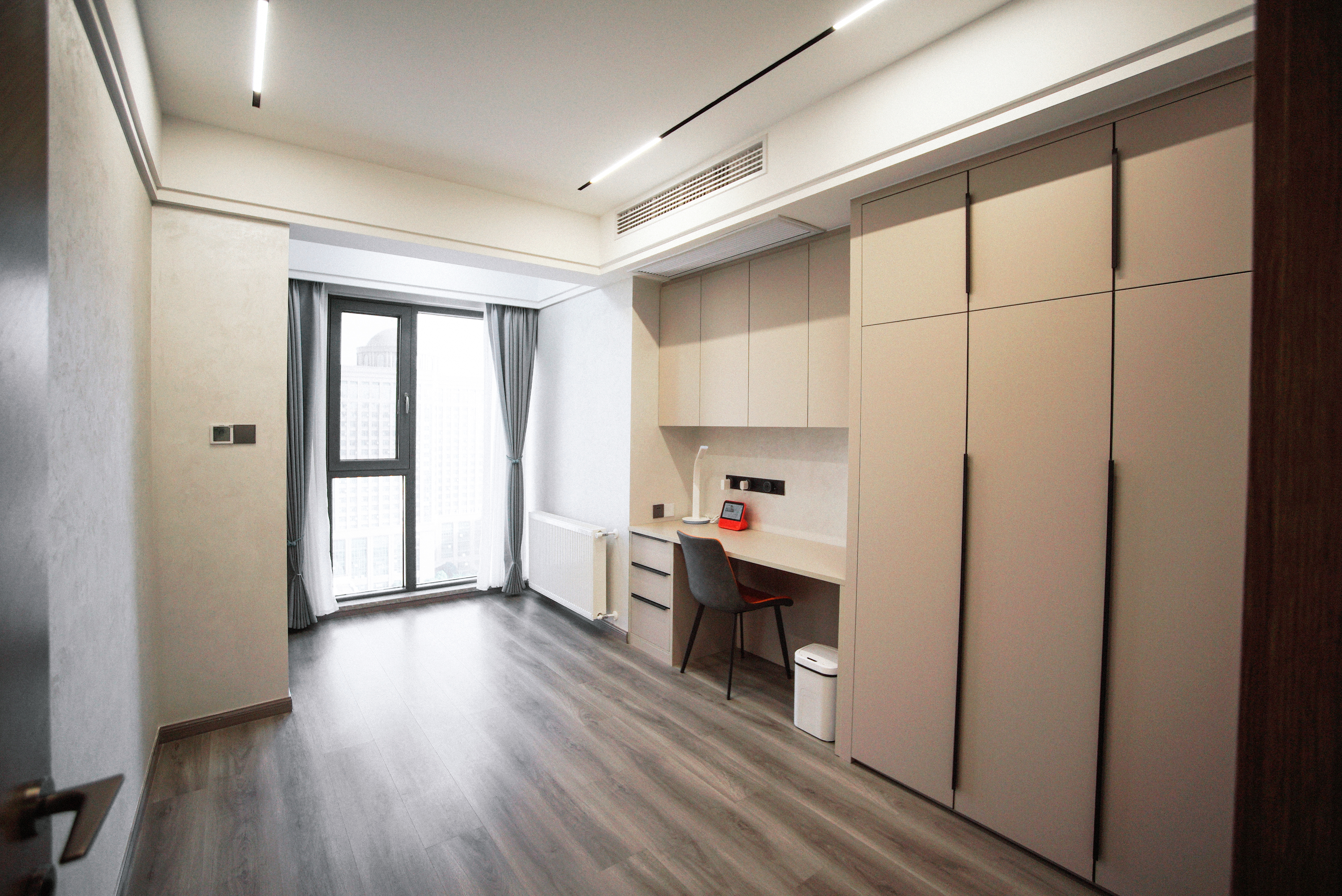 • 這是一個單獨的休閑書房,將陽臺直接納入室內,做大面的落地窗,讓室內光線更強。一面墻體做上了儲物柜,書桌內嵌其中,上層空念也不能浪費,直接做上了吊柜。房間中部留空,方便業主自由活動。