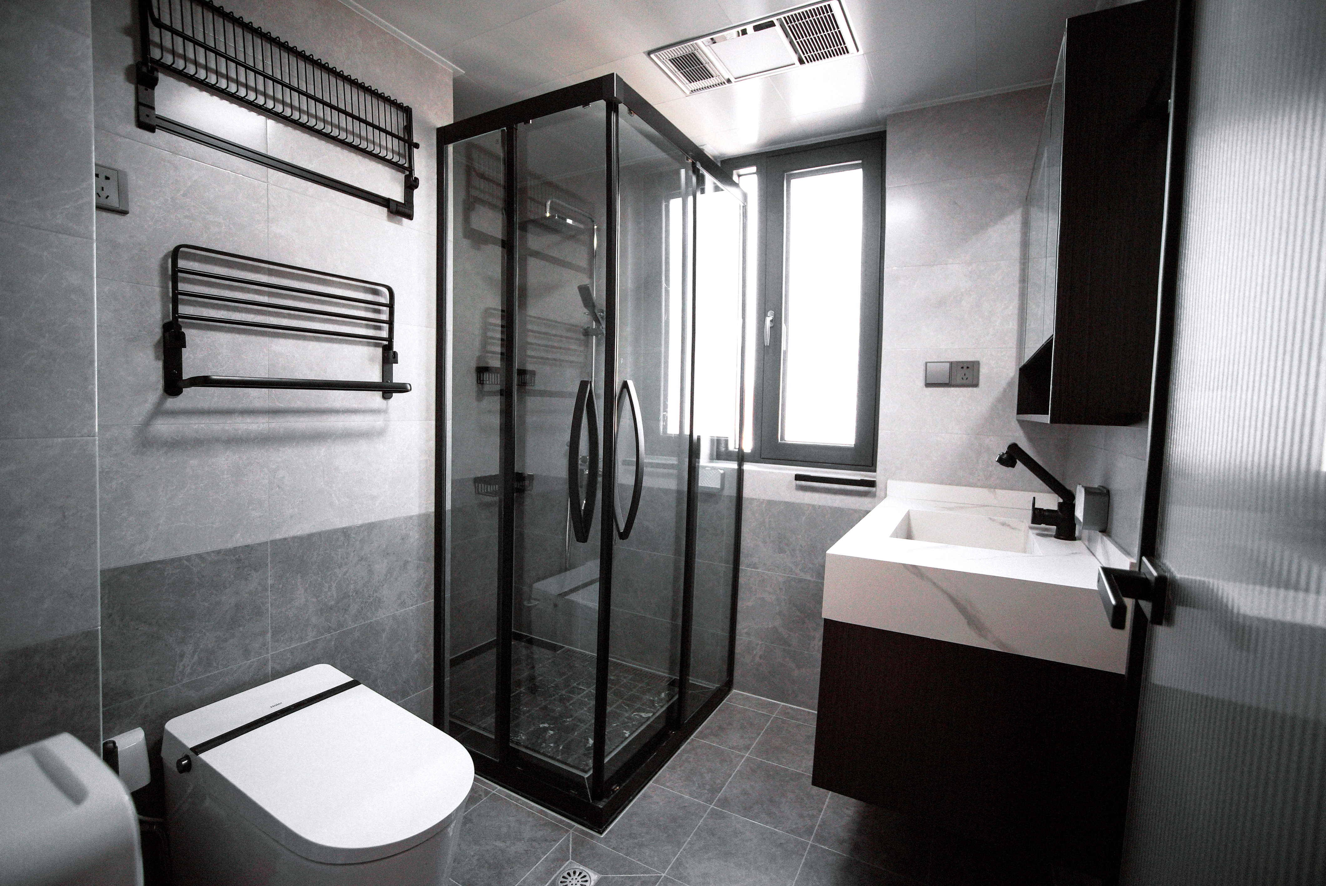 • 黑框玻璃隔斷出淋浴間,避免弄濕整個空間。毛巾架掛于馬桶上方墻面,充分利用有限空間。巖板洗手臺置于吊柜上,方便業主打掃清理。鏡面做柜門,底部留空,方便業主存放洗漱用品。