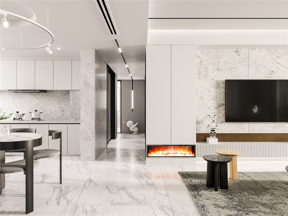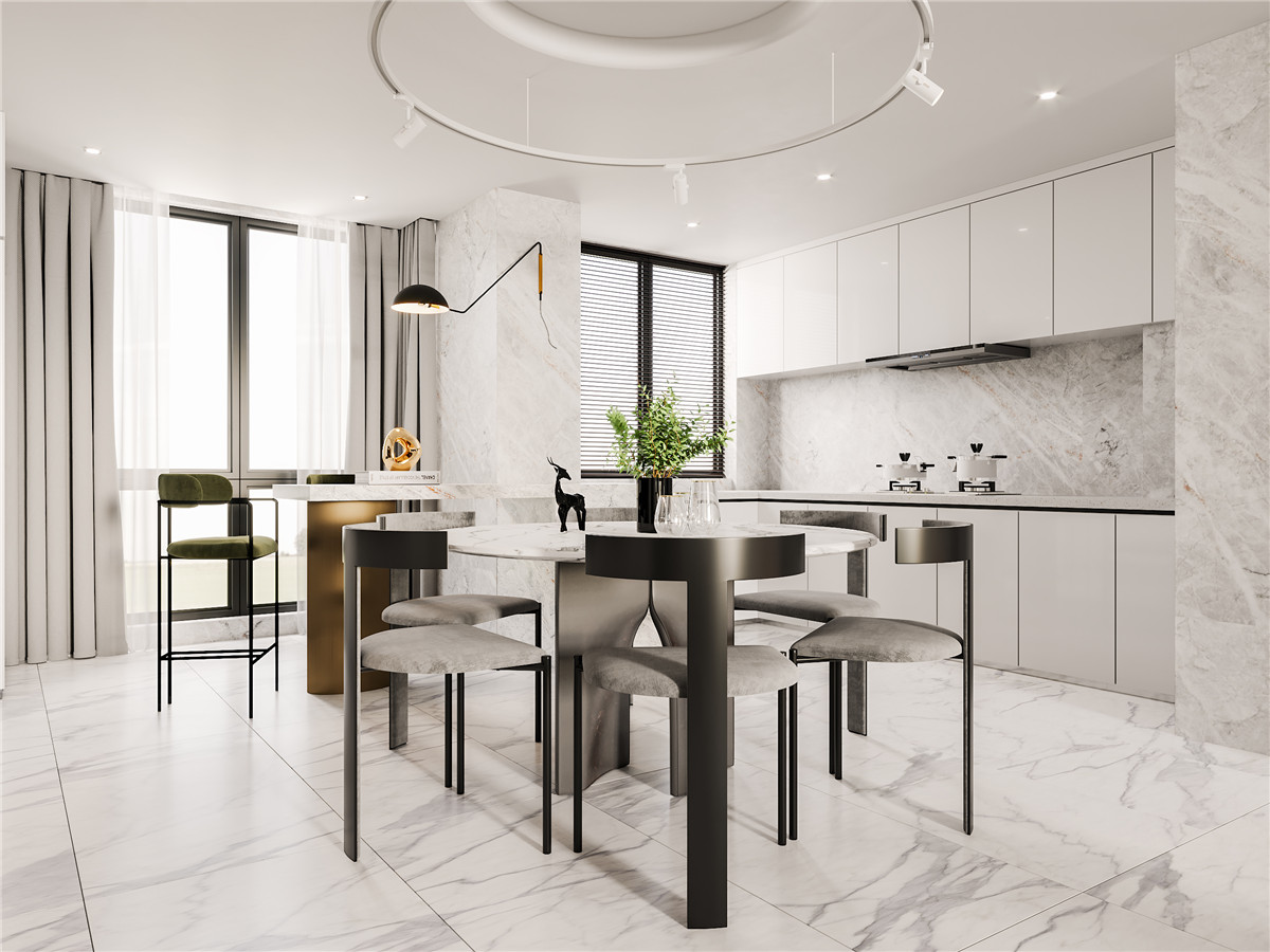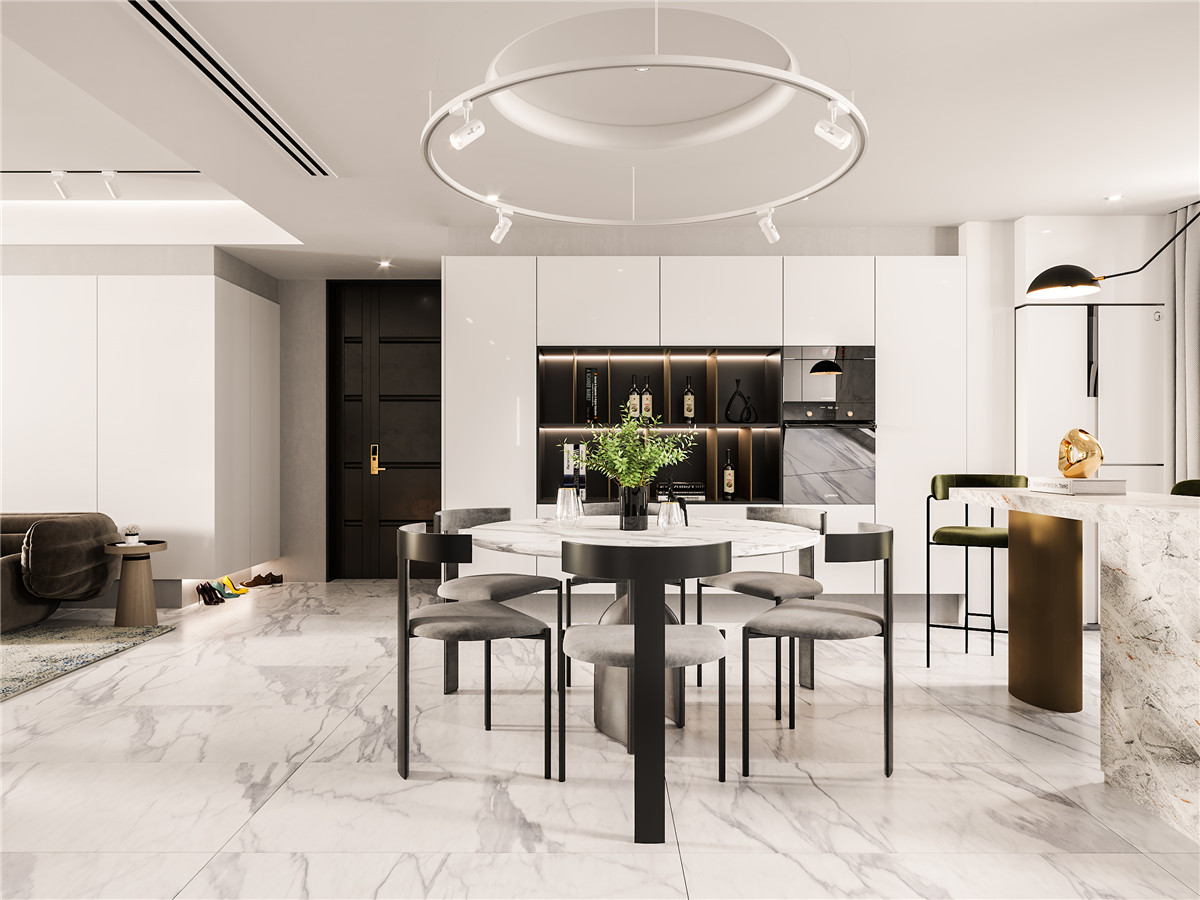 本案是一對90后小夫妻的婚房,女主人喜歡烹飪希望廚房大,男主人希望有個獨立書房。根據業主的生活習慣本方案的定位是現代簡約風。白色柜子搭配大理石上墻和爵士白花紋的全拋釉地磚讓整個空間變得干凈大氣。開放式廚房搭配吧臺也為女主人的烹飪愛好提供了平臺。合理的劃分了主臥和兒童房的區域在保證了兒童房的功能上為主臥增加了一個衣帽間保證了儲物空間。