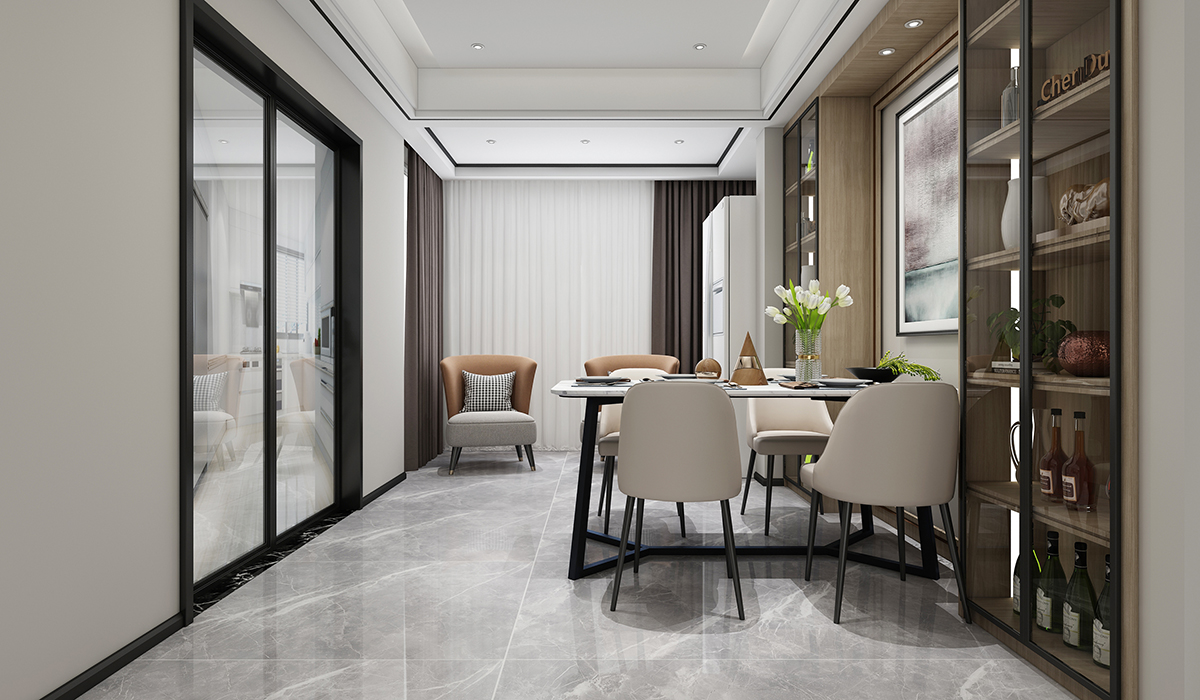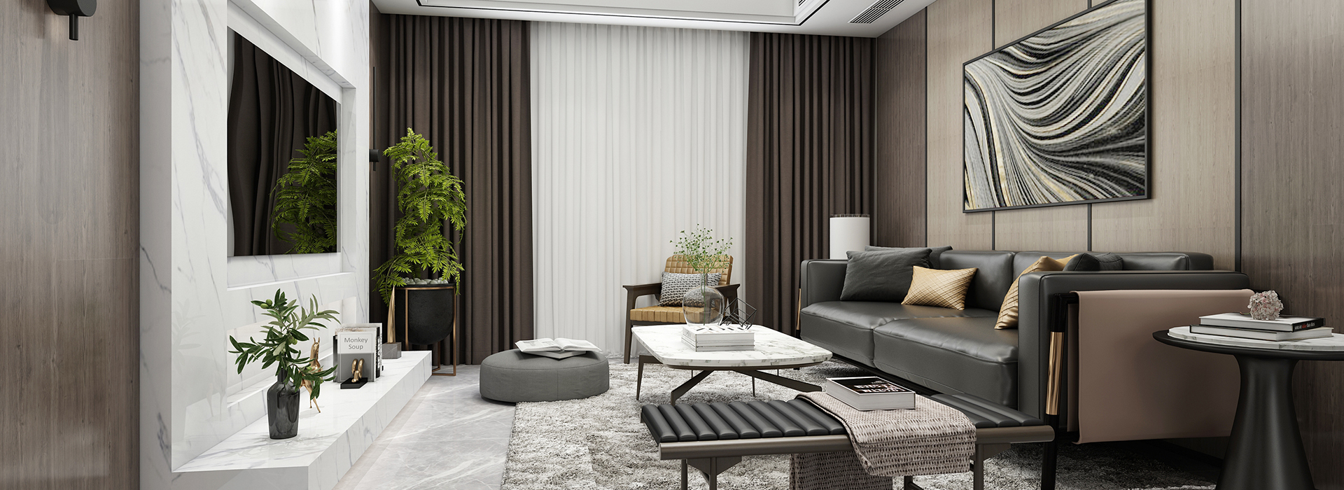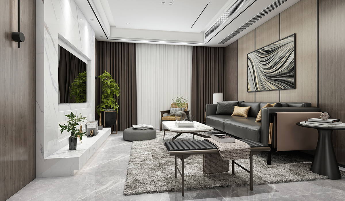 業主向往現代精致簡約風。在滿足日常居住的需求下,整體風格顏色材質以黑白灰為主,通過對色調深淺的調整,及穿插溫潤木質元素來打破暗調沉悶的氛圍。