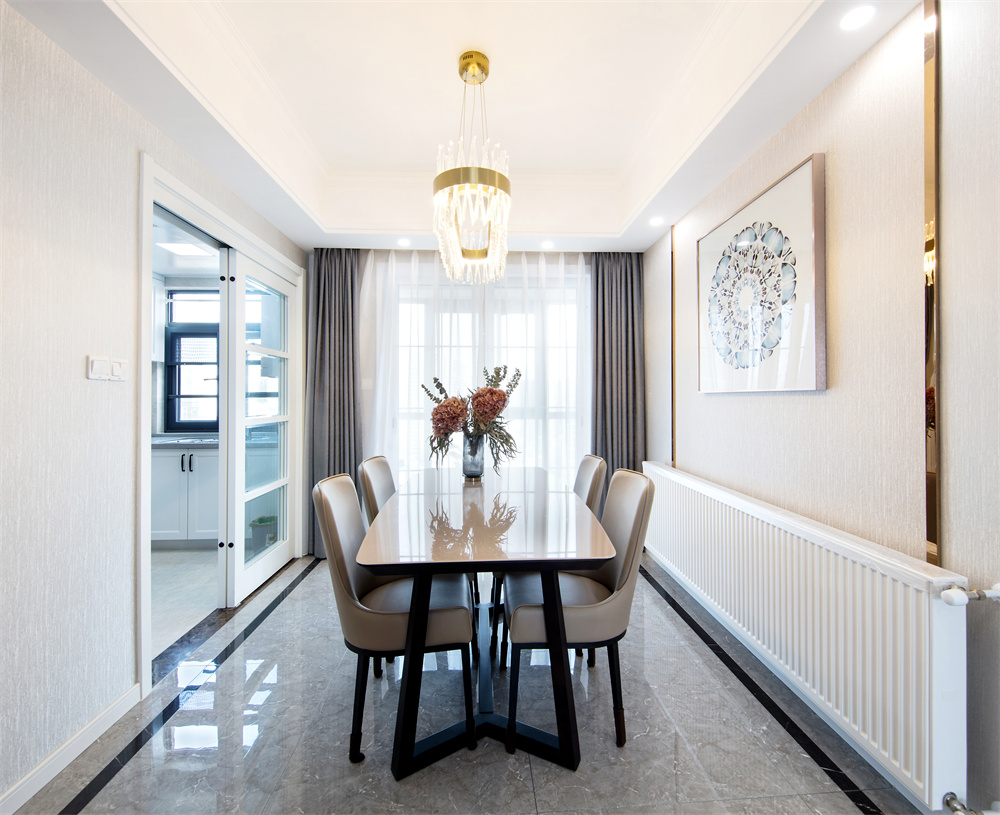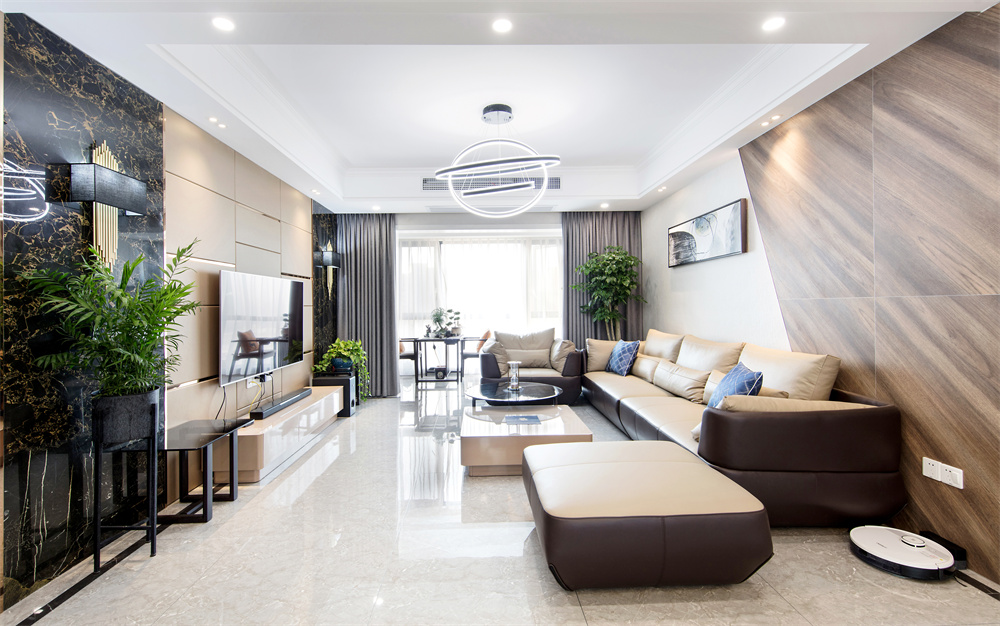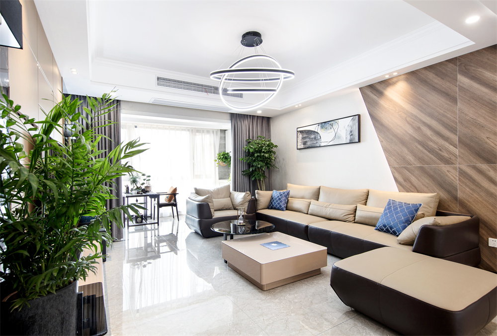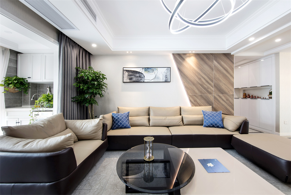 本案為現代風格,在滿足客戶收納的前提下,讓家里的每個地方都是一個景點,沙發背景墻的設計現代立體,與玄關搭配,帶來一種時光穿梭的感覺