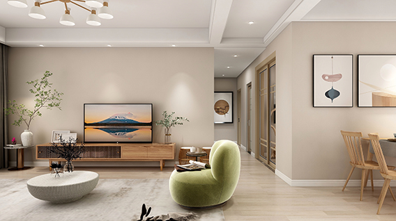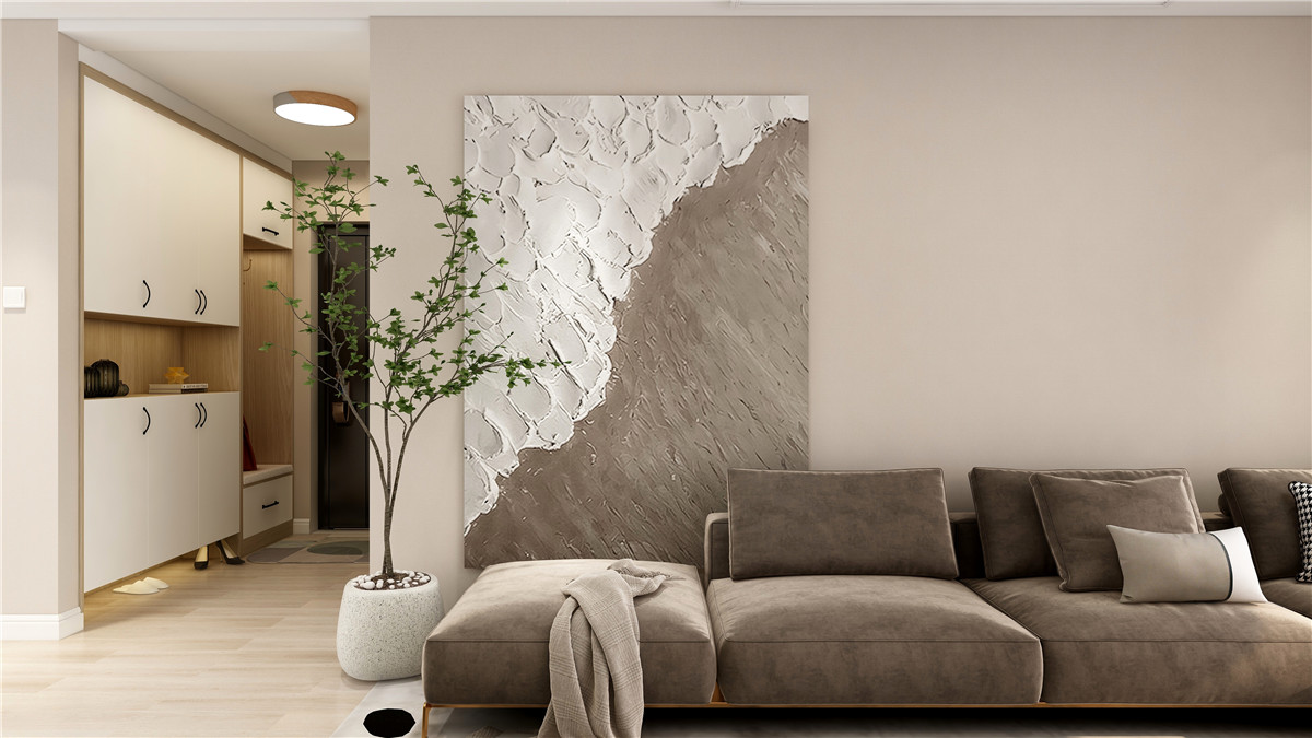 色彩明亮的客廳,暖冬的時候陽光灑滿整個客廳理想空間,質地柔軟的沙發,立體感極強的裝飾立面,陽光穿透灰色的紗簾灑落在橡地板上,顯現出無盡的溫暖與明朗,讓房子的主人更加舒適享受生活帶來的新福時光。