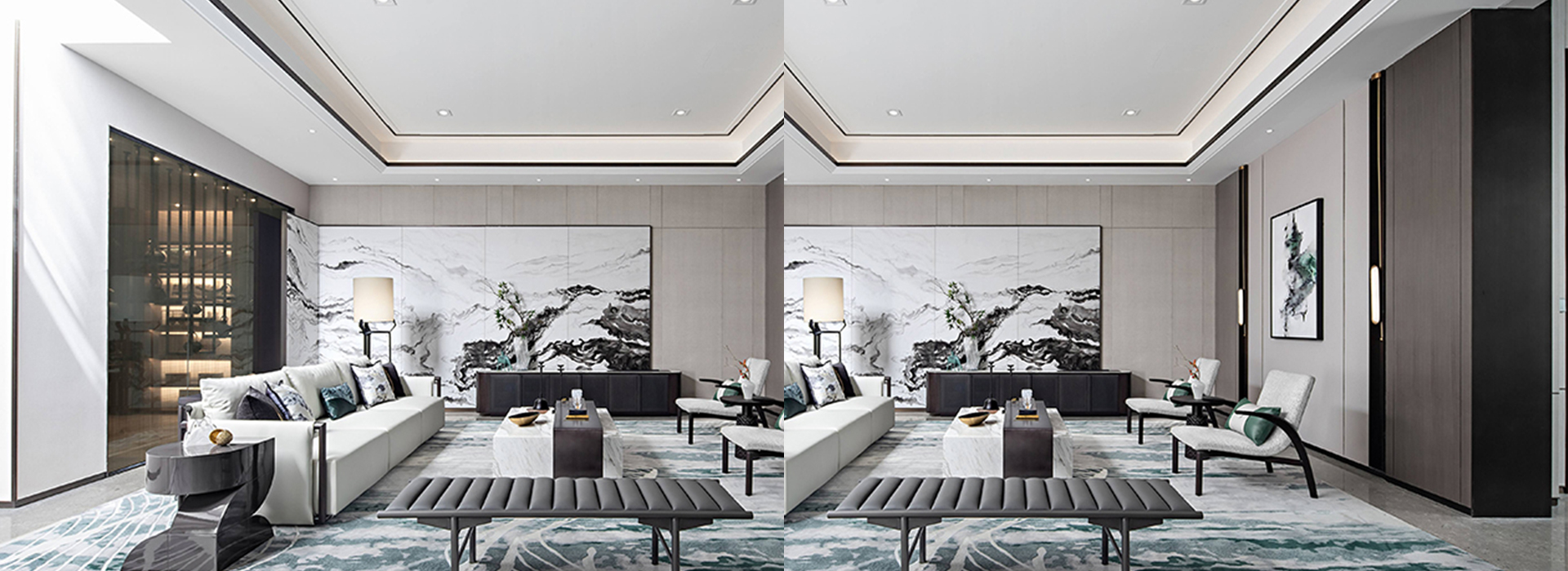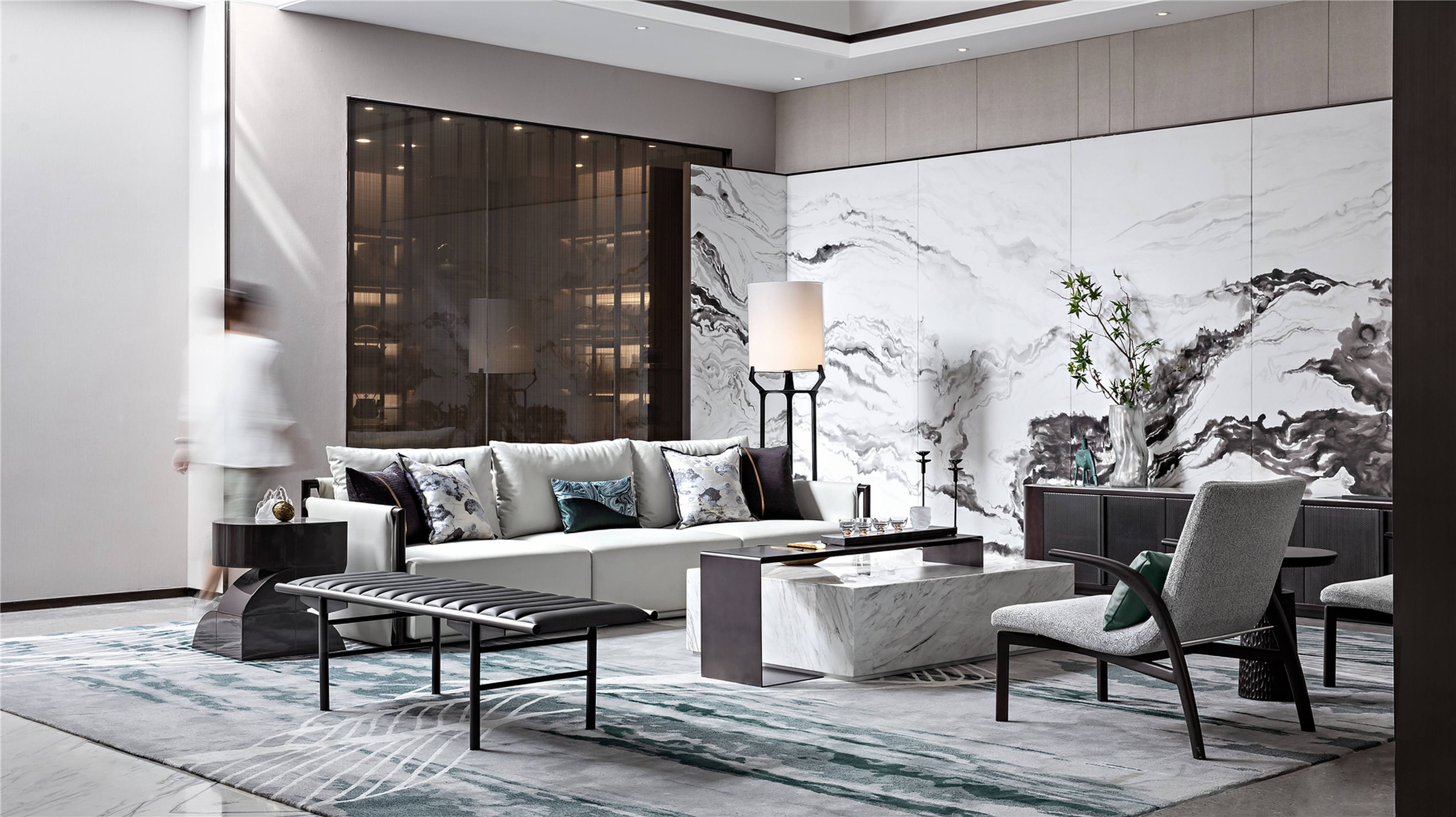 東方情懷室內設計說明: 本空間內的分隔界面多呈現出“退讓”的姿態,“進”,其實也是為了形成“退”,這些都符合東方人的思維習慣:在“退讓”和“遮掩”中內斂地表現“層次”和“深度”。又由于借用了鏡子,更加深了空間的層次,欲遮還掩的空間可令人產生一種期待中的美感。客廳公共通道的設計概念,取意于江南人家磚瓦房屋檐下的“走廊”,吊頂以隱藏空調風機,形成壓低的“屋檐”,地面爵士白大理石上鋪上東方意境的地毯。上下呼應則形成一種傳統的“灰度”過渡空間,可喚起人們兒時熟悉的回憶。
