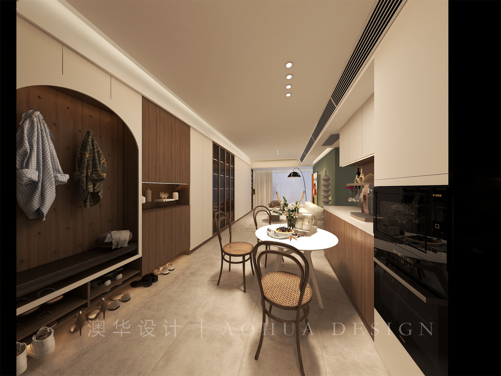 • 弧形的頂面讓廚房和餐廳和其他空間區別開來做到空間的劃分,同時又和建身區具有互通性,可以在功能上和動線上游洄。