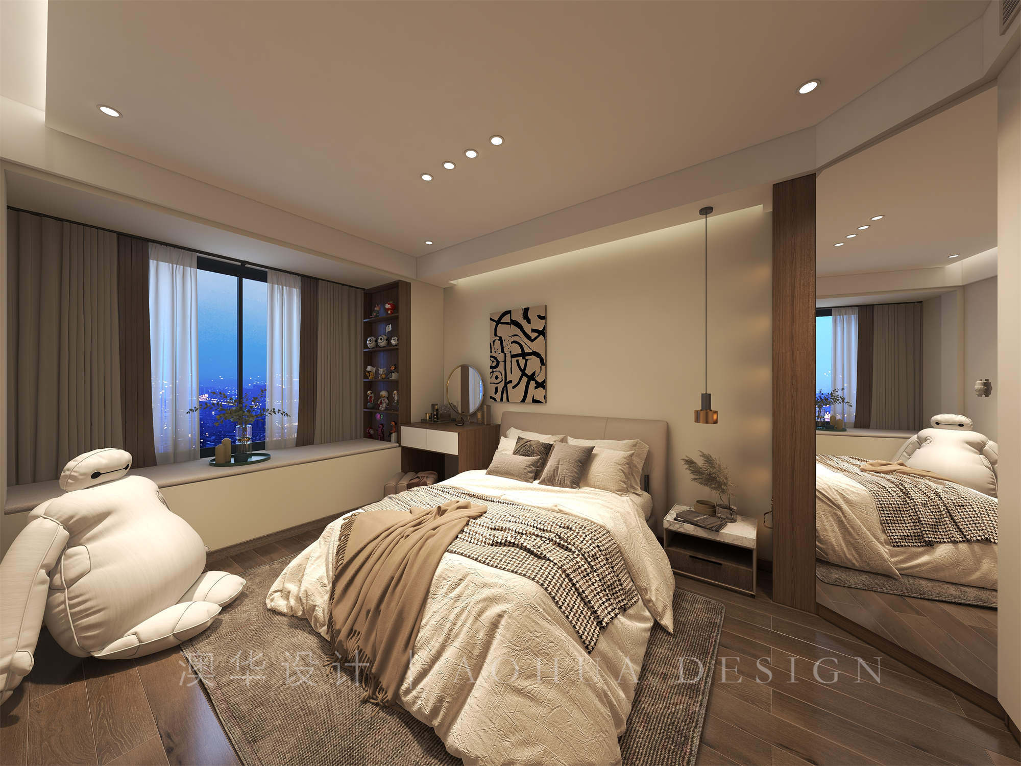 • 臥室是最私密的空間,且功能純粹。低飽和基調自帶高級感,在空間中暈染開來簡約和舒適。