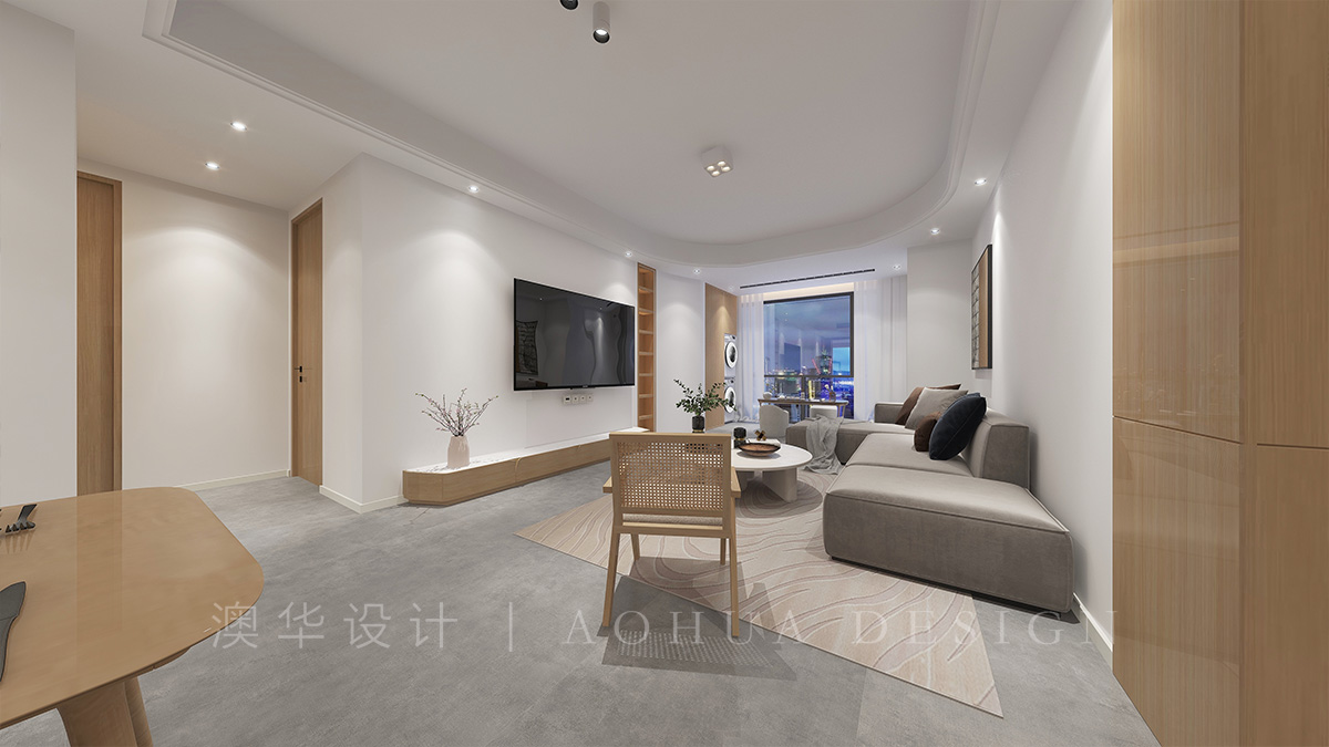 • 色彩搭配主要以白色和木色為主,搭配啞光灰色地磚簡單耐看,頂上的戶型吊頂弱化了空間的線條感,使空間更柔和。