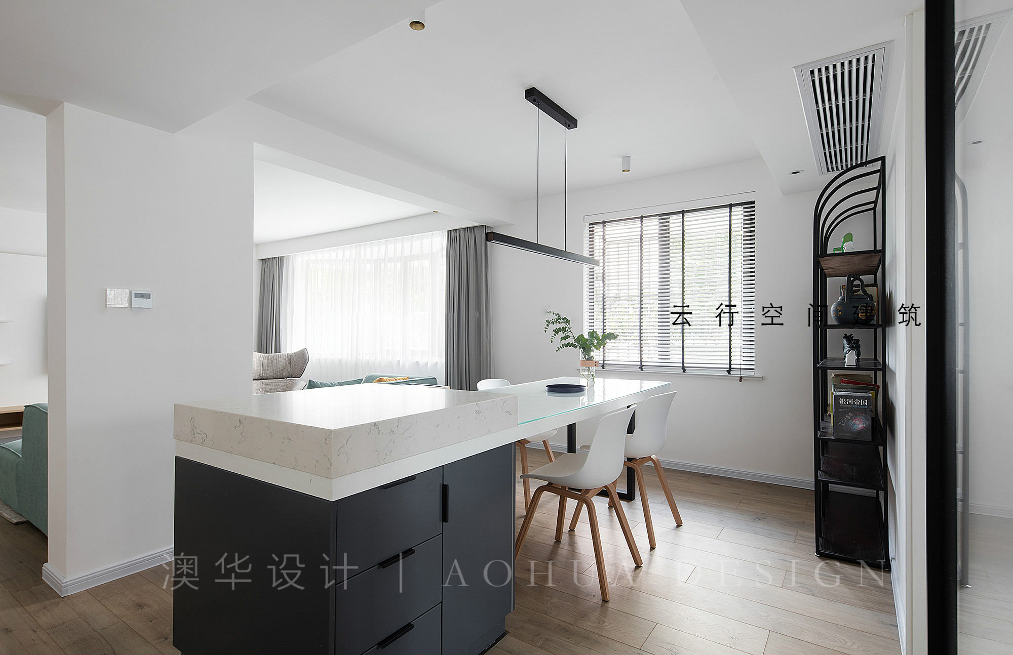 • 餐廳餐桌采用和島臺結合的方式。餐桌考慮到預算以及與島臺的銜接度,臺面選擇了現場制作。白色混水油漆飾面,為保證油漆面后期使用中不被破壞,在臺面上增加了 1.2 cm 的鋼化防爆玻璃,桌腿則在淘寶購買對應高度的金屬支撐,沙發后面的矮柜則作為餐廳和客廳共同的收納柜使用,餐廳書架可作為餐邊柜使用,同時可以作為餐廳以及客廳的裝飾柜。