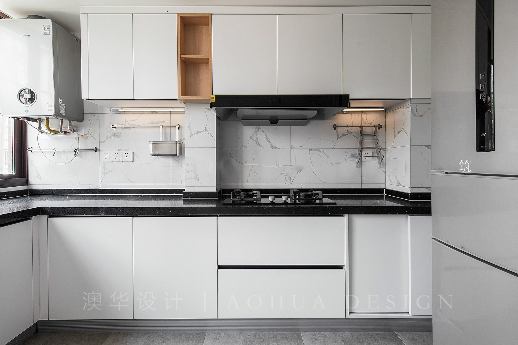 • 廚房維持原有格局,為了讓視覺更通透,墻面均采用白色瓷磚鋪貼,地面則采用灰色水泥磚,更加耐臟。柜體采用白色門板,最右側的門板由于冰箱位置的關系,想最大化利用地柜空間,采用了移門,方便拿取。