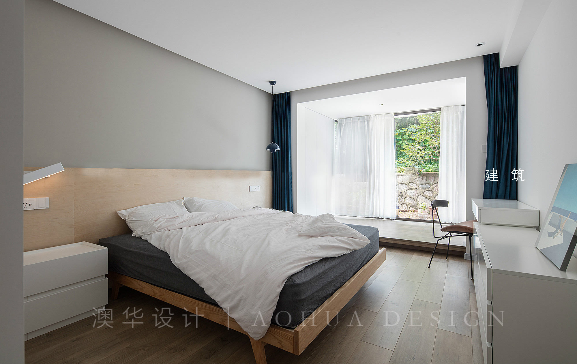 • 主臥室與陽臺打通后,整個空間采光充分,更加通透;陽臺區域抬高,分割出休閑區,可席地而坐,床頭背景板作為靠背,采用生態板直接鋪貼,保留原始質感,背部則設有燈帶;床尾增加梳妝臺,方便女業主梳妝,同時還兼具電視收納柜的功能。