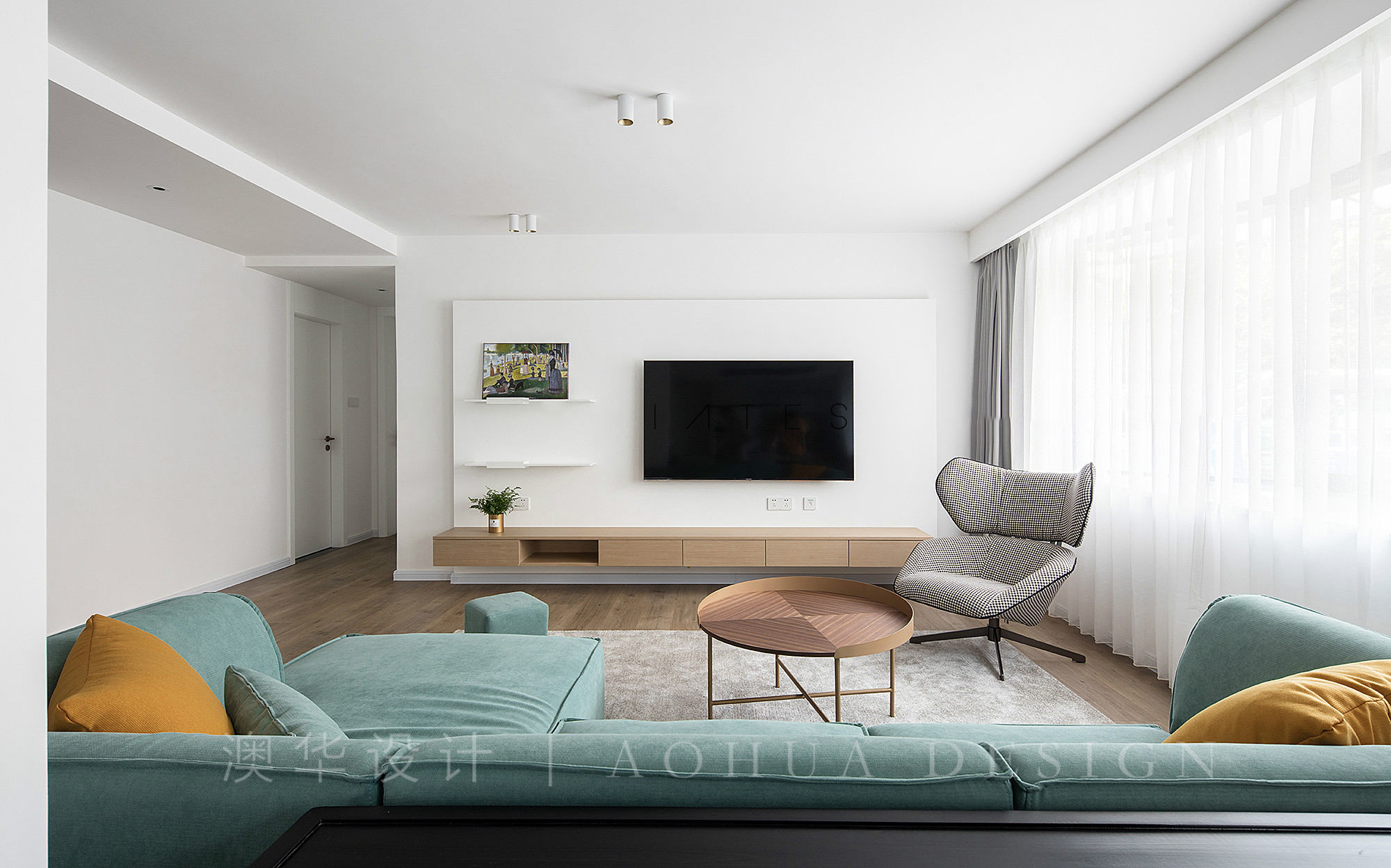 • 經過改造的客廳,采光效果絕佳,室內整體色調溫馨。交互式客餐廳的設計大大增強了空間的視覺通透性,木色電視柜和淺綠色的沙發中和了整個空間的氛圍。頂部均采用無主燈設計,夜晚環境下通過頂部針對性點光源以及電視背景氛圍燈帶可營造出更加適合居家更安靜的室內氛圍。電視背景在原有墻面基礎之上增加了另一層表皮設計,背后藏有氛圍燈帶,提供不同的視覺效果;懸挑的木色電視柜在保證收納的前提下,也方便打掃衛生,同時讓空間更加透氣;層板則作為點綴。