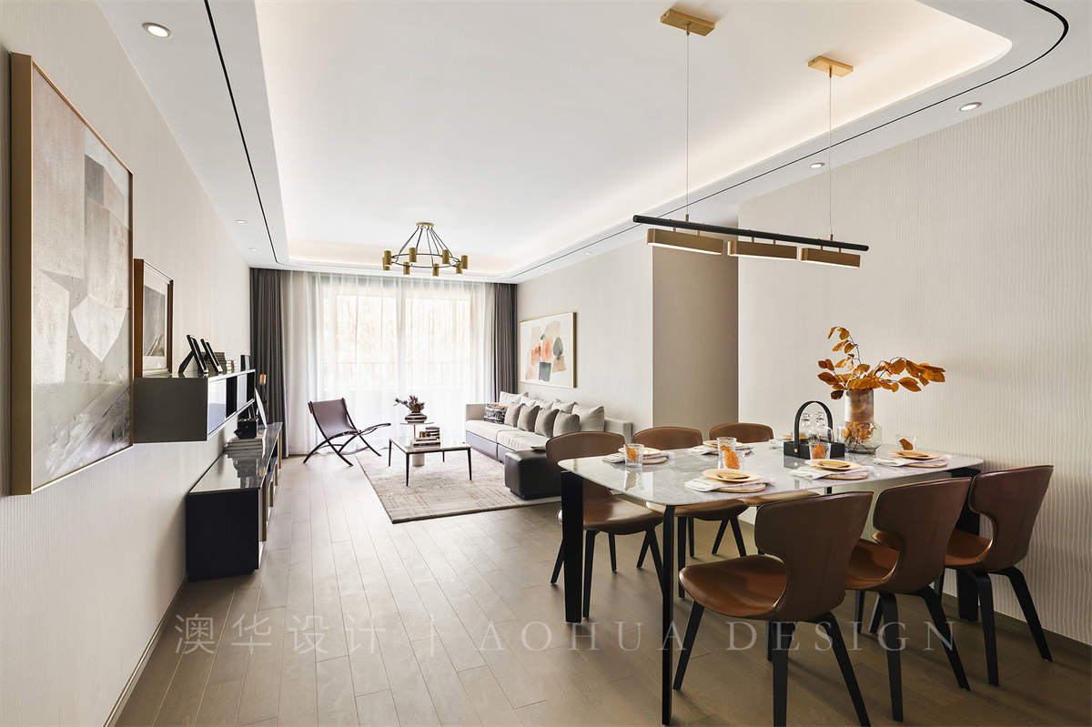 • 客廳空間在整體極簡和雅的氣質中,不同層次的青、白、灰色和諧相融;軟包、瓷板、皮料等現代風格材質,構塑空間高雅大氣的當代調性。錯落有序地展呈在各處的藝術品,選自沈勤、秦修平等新派藝術家,將無數主張與思想,容納在平靜的美學中,豐富空間的精神人文內涵。