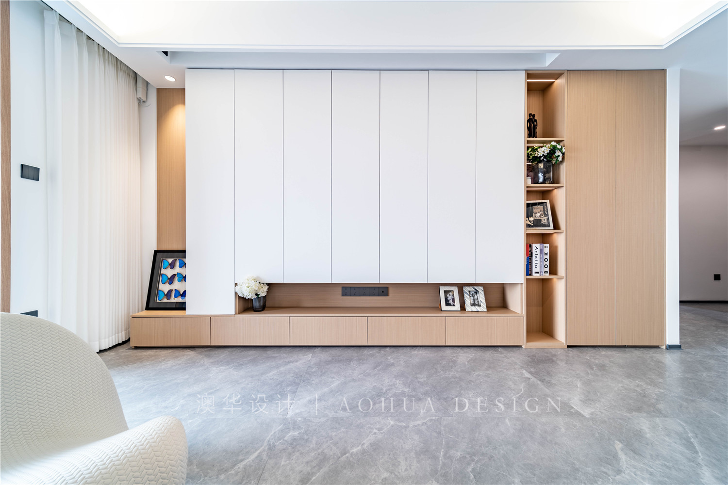 • 沒有電視背景墻,取而代之的是整墻暗藏式書柜。潔凈純白的柜門背后塞滿藏書,視覺上絲毫不會凌亂,讓孩子的成長擁有一個永不打烊的圖書館。