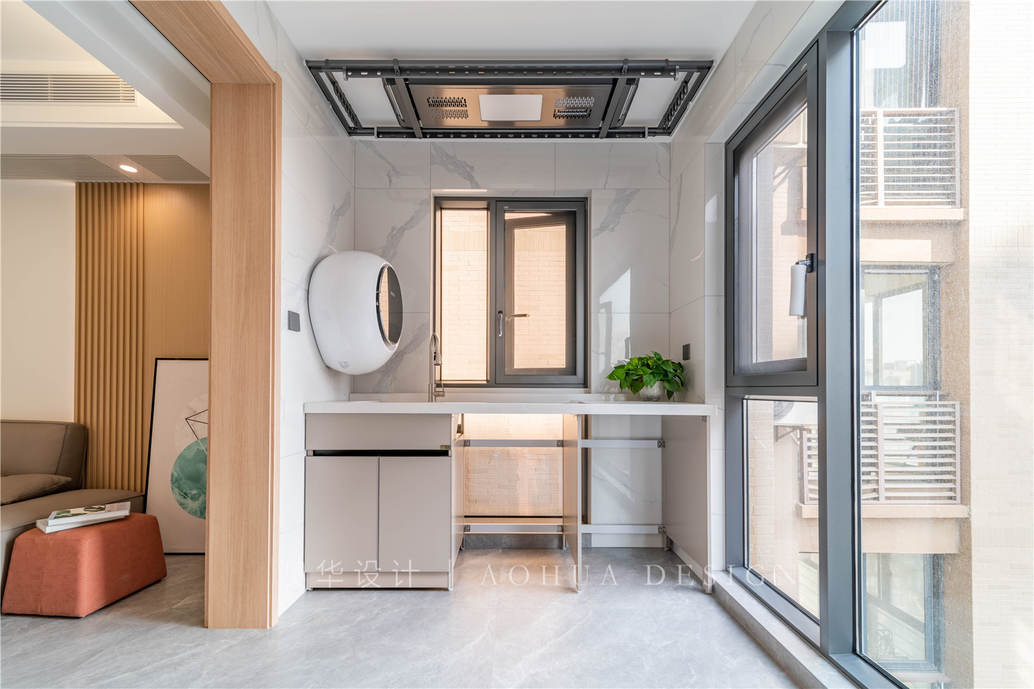 • 利用陽臺打造洗衣區,縮短家務動線。在陽光明媚的好天氣,充沛的光線在室內暢行無阻。一家人也可以在這里飲茶、游戲、閱讀。