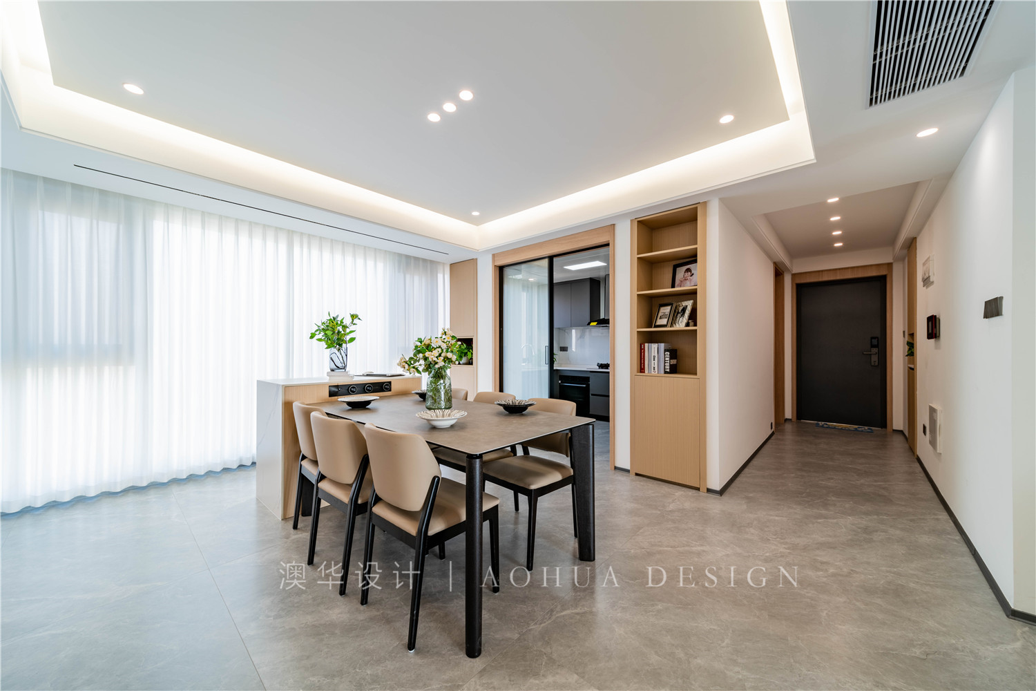 • 不管是陽光氤氳的下午,還是暮色彌漫的夜晚,餐廳的大面積落地窗與隨風飄逸的紗簾,都給用餐時光增添了不少氛圍感。