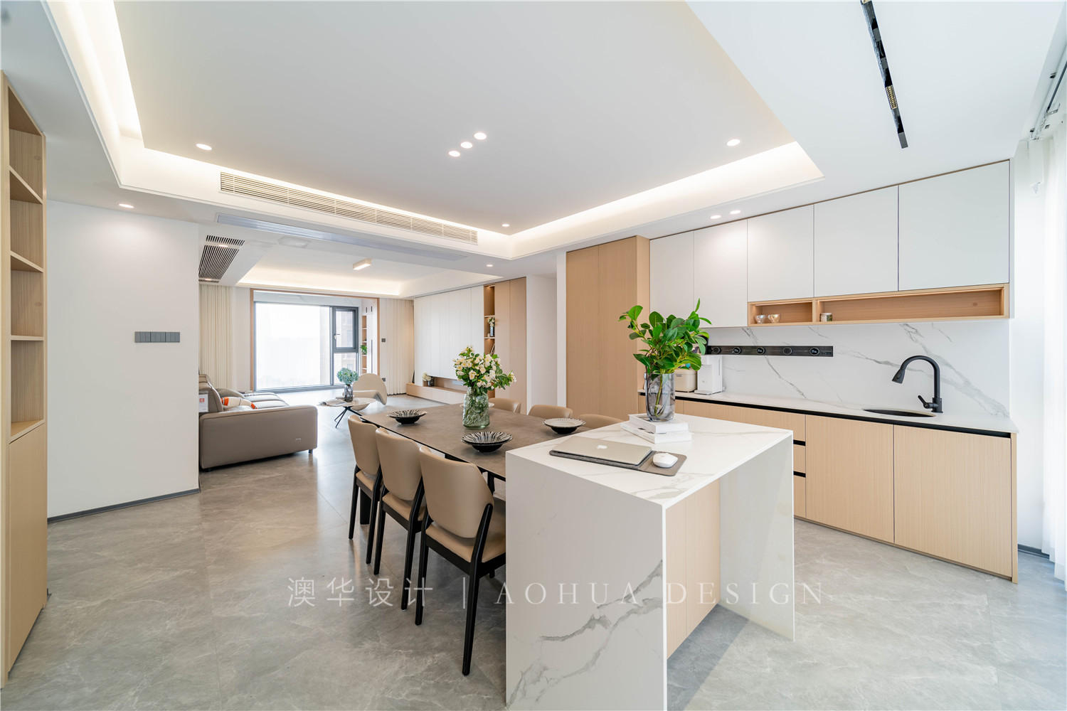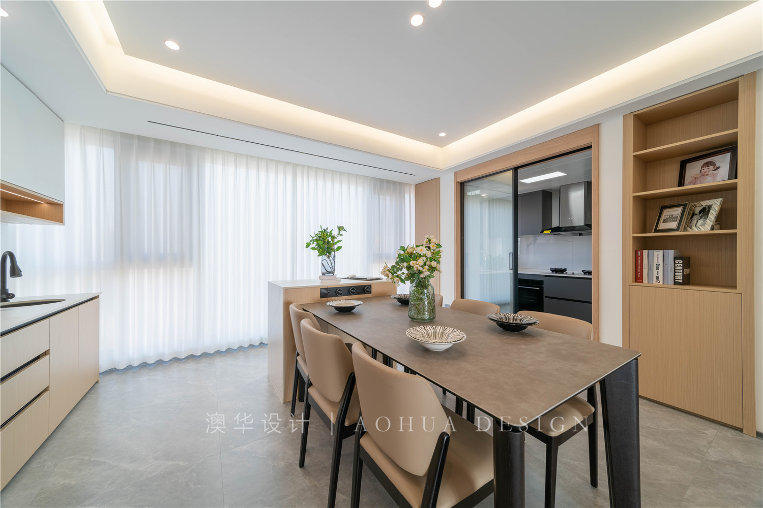 • 現在看到的西廚柜區域原先是一個獨立書房,但真正使用的頻率并不高。設計師索性拆除書房,不僅成就了一個更加寬敞明亮的餐廳,還補充了西廚、水吧、島臺等功能。