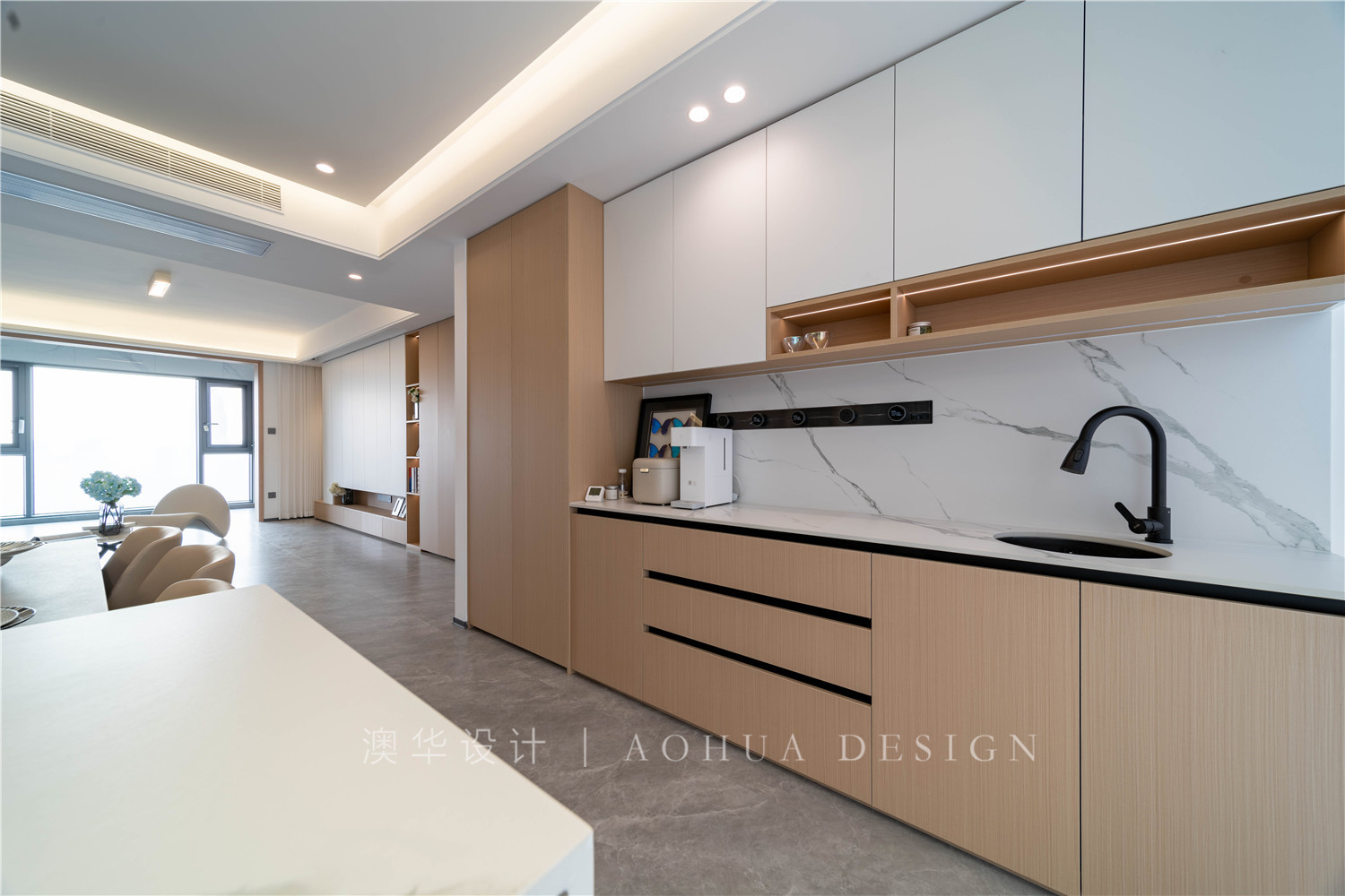 • 一整排西櫥柜補充了廚房功能,一家人的零食飲品也有了更充足的儲藏空間。柜面延續原木+純白的配色,簡單自然,舒適耐看。