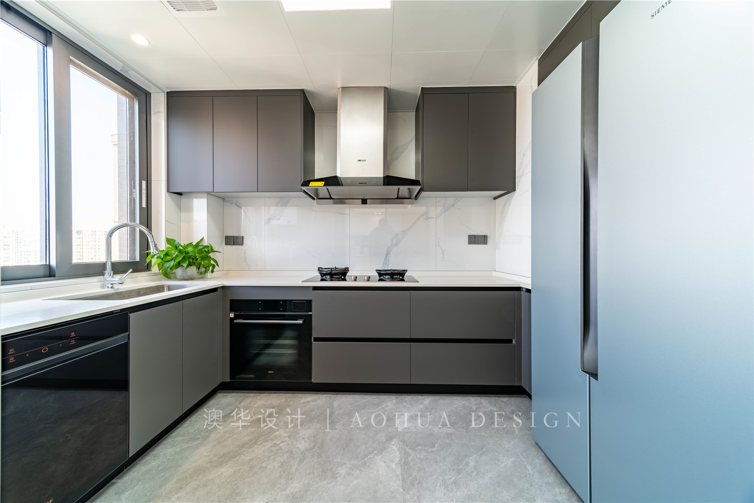 • 廚房吊軌玻璃門,隔絕油煙不隔絕光影。L型櫥柜設計,洗切炒動線便捷。集成灶、雙開門冰箱、蒸烤箱、洗碗機的嵌入,帶來更輕松愉悅的烹飪過程。