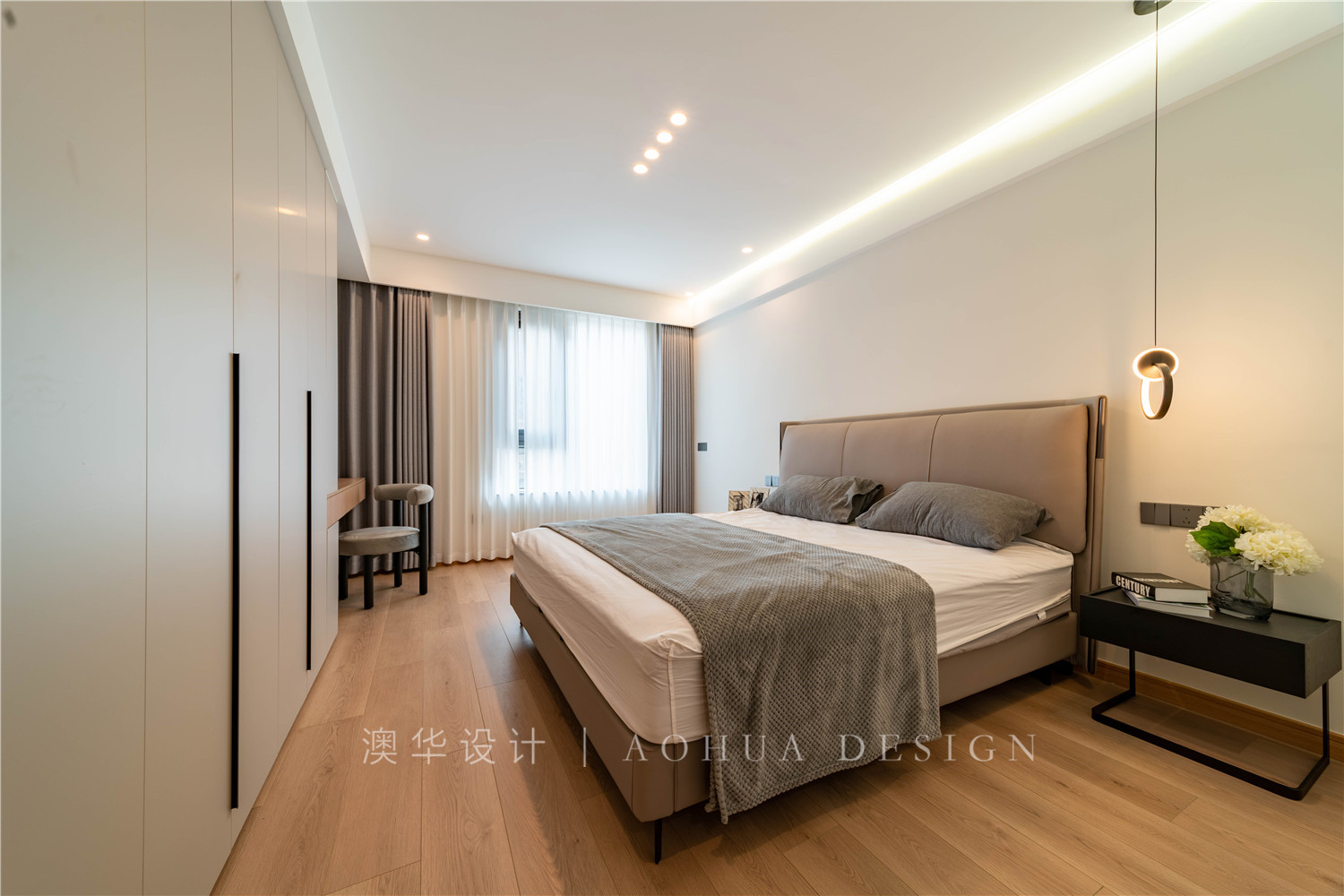 • 原本主臥的收納只有5㎡左右,設計師將主衛墻面往后推之后,留出了空間增加了衣柜面積。整墻膚感衣柜延伸出一個原木懸浮化妝桌,每一個平米都充分利用,更衣、梳妝都更加便捷。