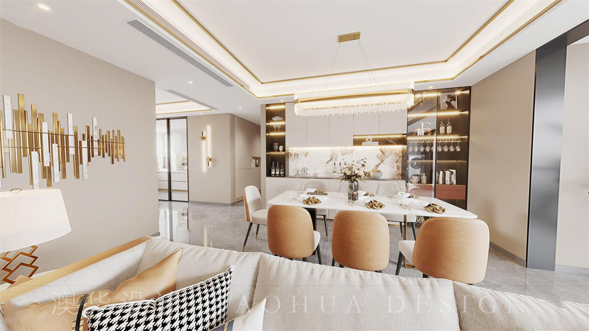 設計師將空間化零為整,確保了整體的動線流暢,保持了南北通透戶型的采光和通風,再此基礎上采用金屬線條與石材的巧妙結合,打造出輕奢華麗的整體效果。