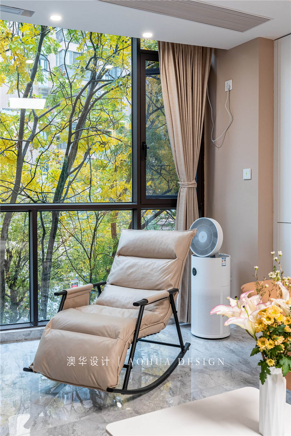 巨幅落地窗帶來極佳的觀景視野,清風與綠植將自然引入空間,模糊了室內外的界限,空間與自然無聲對話,靜謐與優雅共生。點滴時光的美好,在此得以完美詮釋。