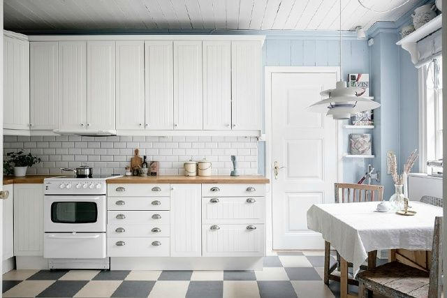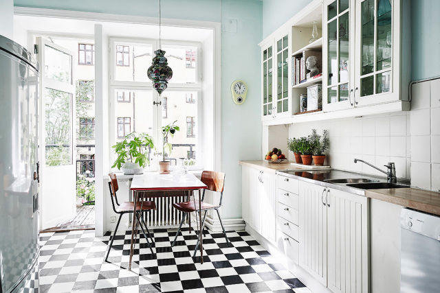 ? ? ? ?幾何拼接瓷磚鋪地,制造設(shè)計亮點。操作區(qū)的墻面貼亮面磚,便于清潔。其他墻面可以刷漆,增添空間的色彩感。