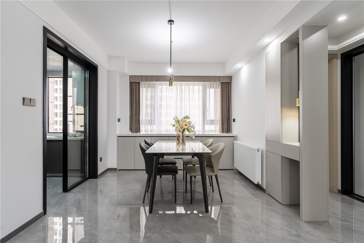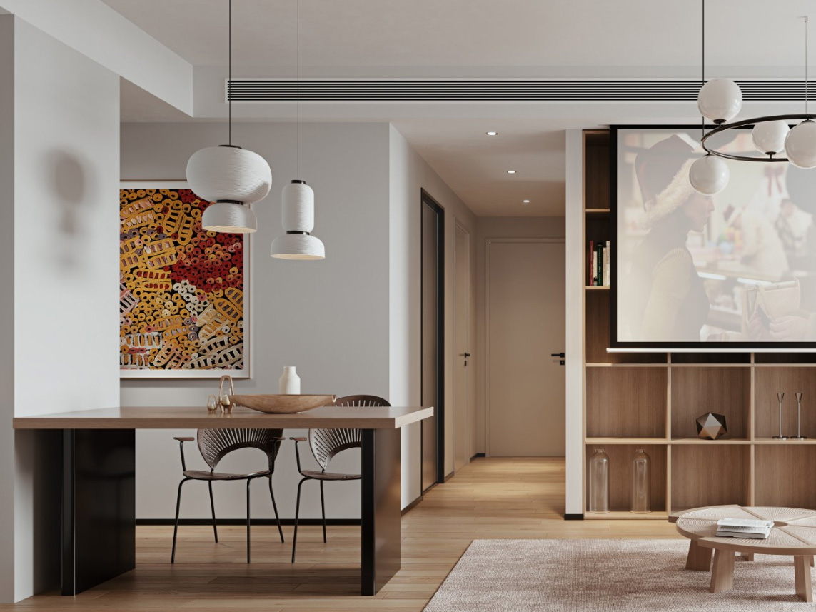 這個(gè)家的餐廳與玄關(guān)區(qū)域巧妙融合,定制玄關(guān)柜與嵌入式餐邊柜緊密相連,冰箱被完美包裹,既體現(xiàn)了空間的連貫性,也為家居生活增添了品質(zhì)感。