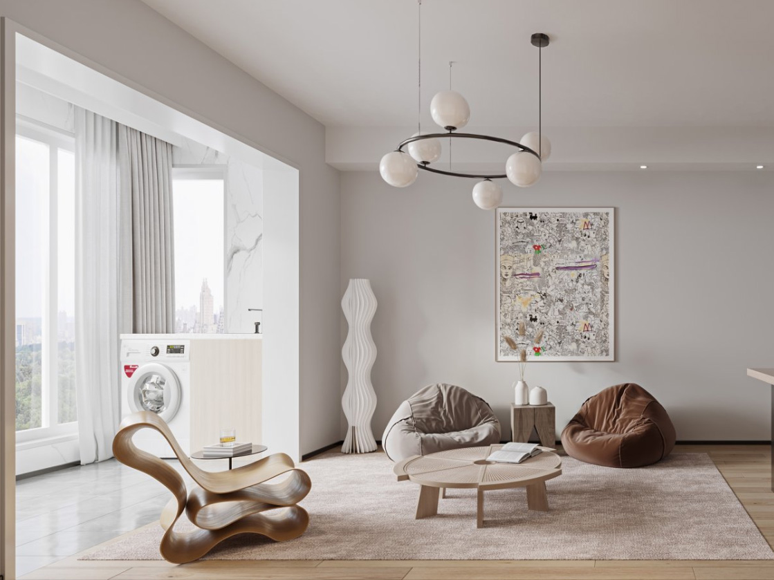 大面積的白色搭配上灰色沙發(fā),整體給人簡(jiǎn)約的樸素感。而由弧線組成的木色地毯則為空間增添了一抹不一樣的獨(dú)特氣息。