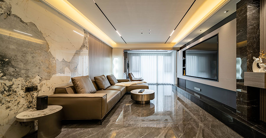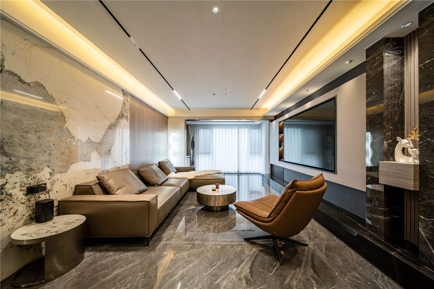 嵌入式的照明燈具既可以滿足日常使用需求,又易于打理。圓形大理石茶幾簡約清新而又不失高級藝術感。