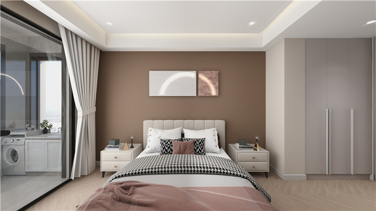 大面積落地窗有效提升臥室采光,藕粉色背景墻營造溫馨靜謐感,搭配上色彩裝飾,簡約而又時尚。
